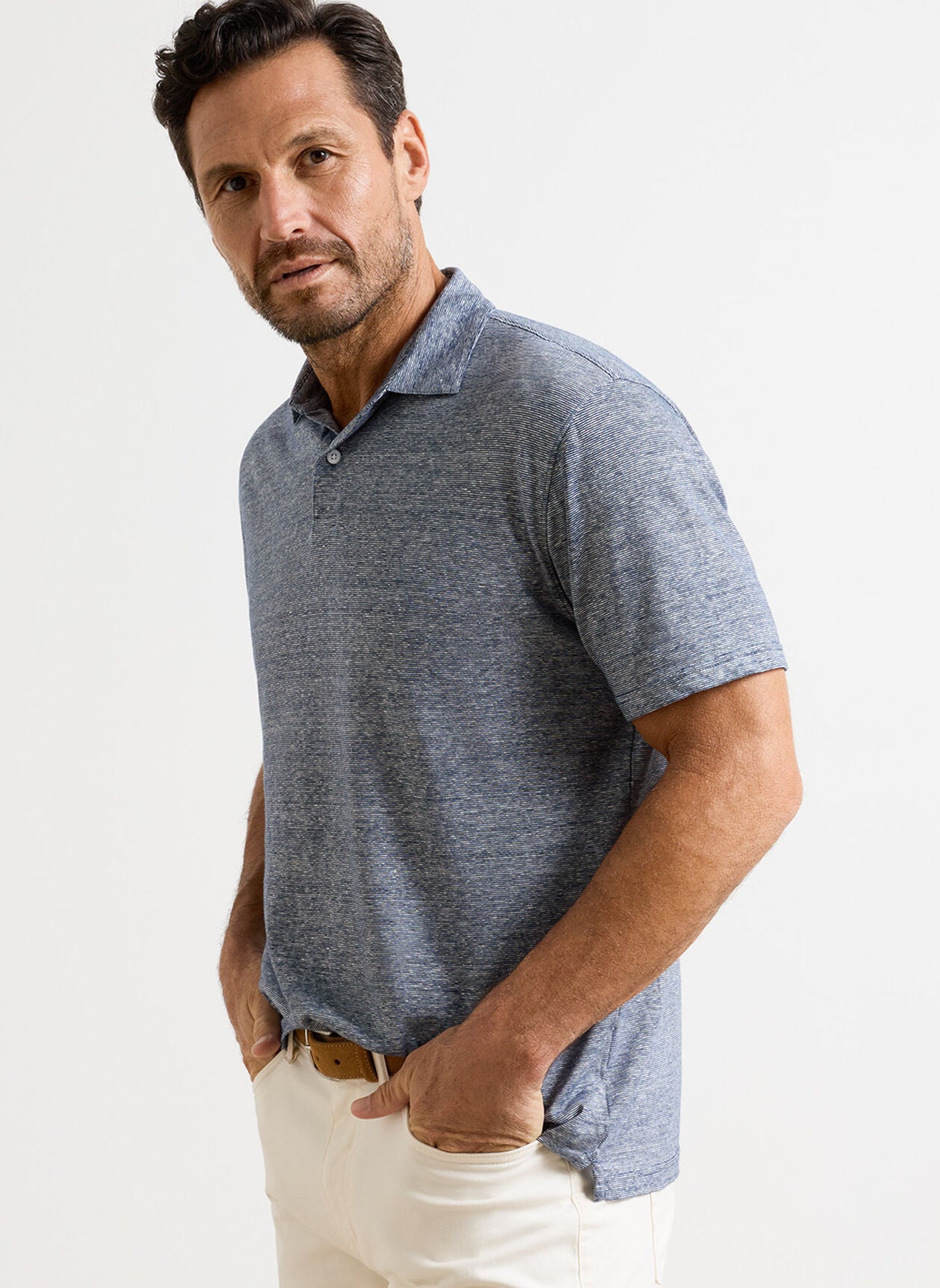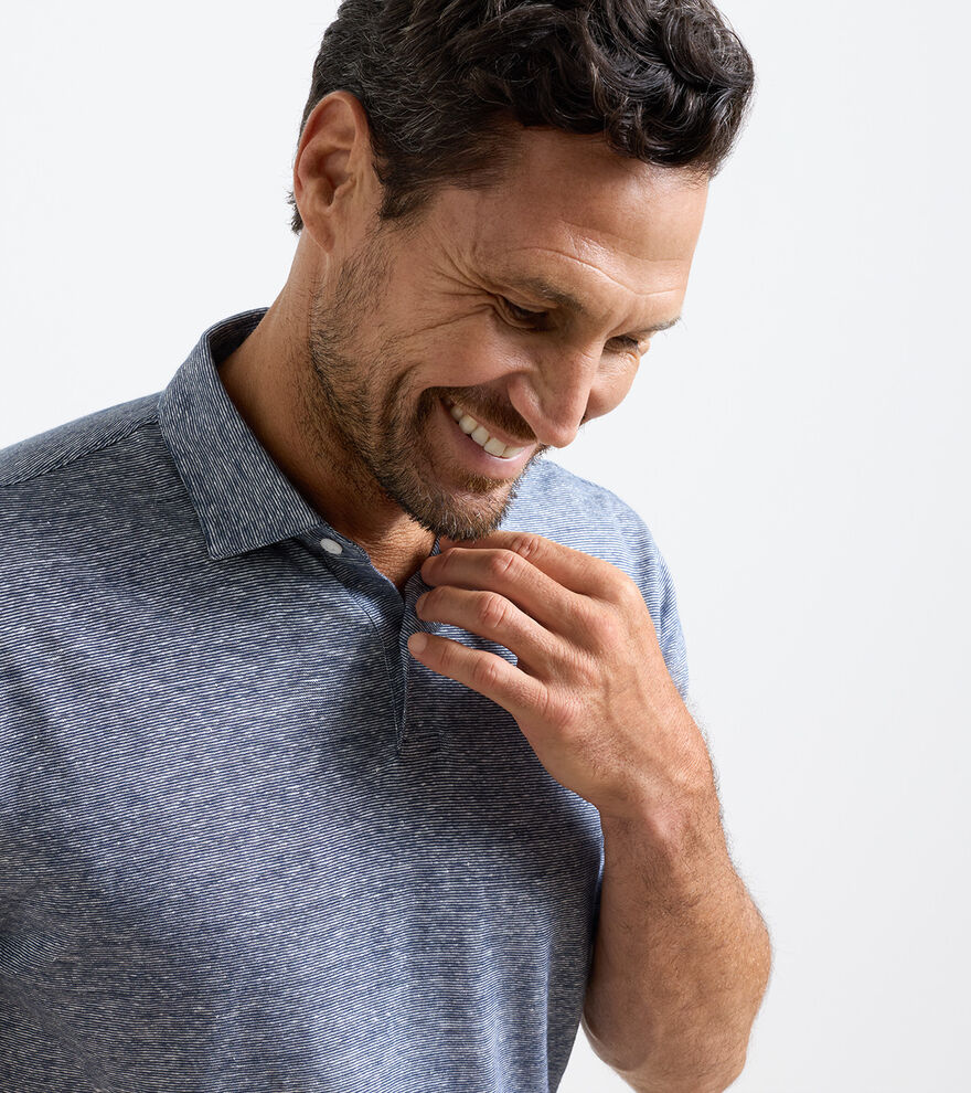 The Sanibel polo is a lightweight cotton and linen slub fabric. Classic fit designed with a slightly shorter length and low-profile collar.