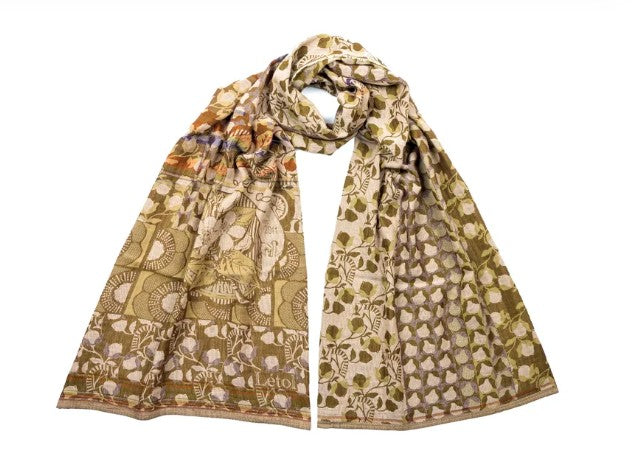 Exquisite oblong scarf from Letol Made in France (village of Charlieu) Organic cotton Reversible artesanal jacquard patterns Rich, textured threads (not printed!) Approx. dimensions: 17.5in x 80in Hang dry (no bleach, no iron)