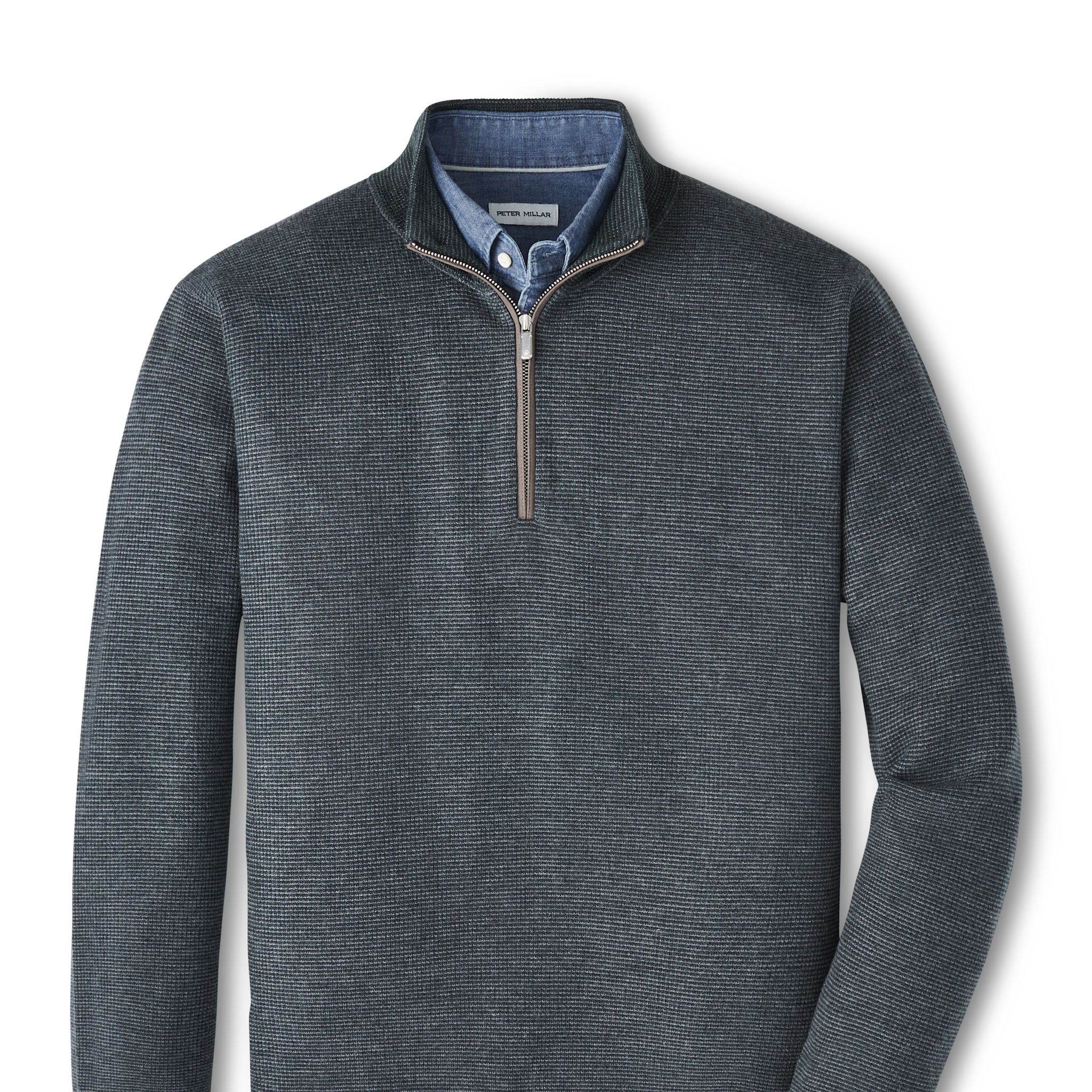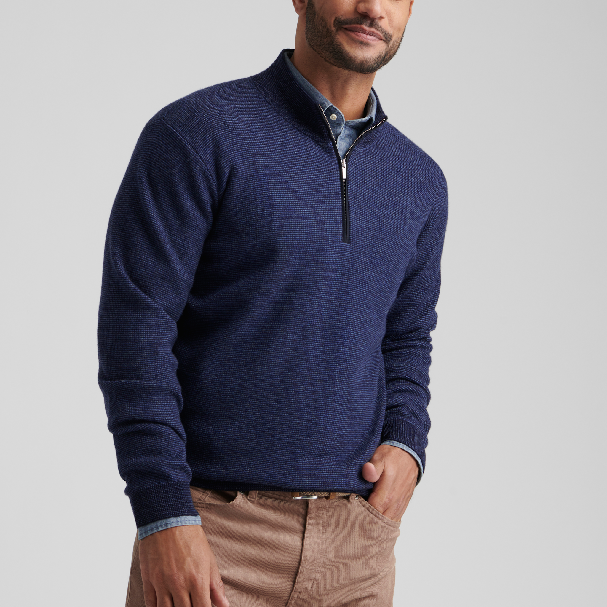 Crown Collection A subtle textured stripe design puts a twist on this traditional Merino wool quarter-zip. Knit fabric with a lofty feel makes it ideal for layering, while a sueded placket offers a distinctive touch. Men’s 100% Merino wool sweater 12 gauge knit Hand wash cold; lay flat to dry...